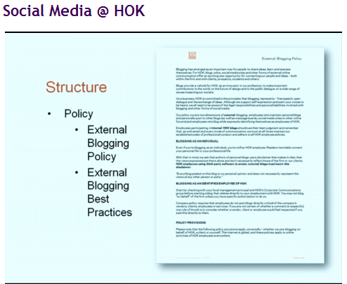 Но он был посвящен скорее проблемам маркетинга, а не пользователя. В презентации "Social Media @ HOK" показаны моменты, связанные именно с внутренней жизнью предприятия. И это мне показалось занятным и полезным.